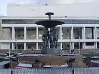 Рядом с театром находится ансамбль фонтанов, автор скульптурной композиции которого — Евгений Вучетич. Фонтан представляет собой квадратный бассейн с центральной скульптурной группой на постаменте из четырёх атлантов, которые держат чашу с бьющими вверх струями. Группа окружена тумбами с фигурами лягушек и черепах, из ртов которых бьют горизонтальные струи. Существует городская легенда, гласящая, что молодой скульптор придал мордочкам этих земноводных черты лиц некоторых городских начальников. Скульптурные изваяния изготовлены из бетона.