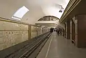 Подсветка центрального и платформенных залов — закарнизная. Путевые стены отделаны белым мрамором.
