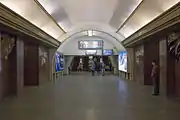 Верхний цилиндрический подземный вестибюль целиком является композицией «Спираль времени», состоящей из горельефов и барельефов, олицетворяющих отображение исторических событий, превращающихся в птиц и лучи, и наконец сходящихся в центре свода, где смонтирована большая люстра с мягким белым светом.