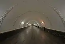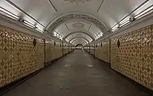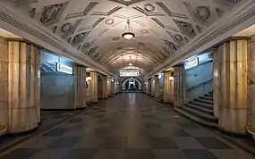 Нефы станции отделены друг от друга, и главное объёмно-пространственное значение приобретает центральный зал[19]. Он оформлен по мотивам дорического ордера[18]. Тяжесть свода принимает на себя горизонтальный карниз[19], опирающийся на каннелированные полуколонны из крупных блоков мрамора Прохорово-Баландинского месторождения[18]. Они увенчаны квадратными бронзовыми плитами, которые выполняют роль капителей и служат прокладками между колоннами и карнизами свода[20]. Выступающие полуколонны зрительно облегчают тяжёлые пилоны станции[21]. Между ними стены пилонов образуют ниши, в которых установлены мраморные скамьи. В верхних частях этих простенков находятся вентиляционные решётки[20].