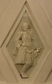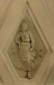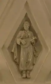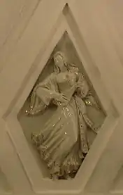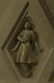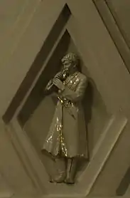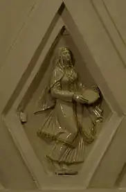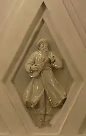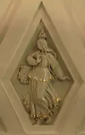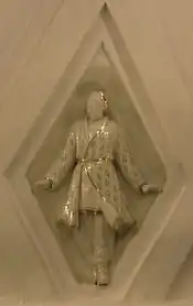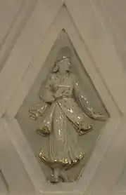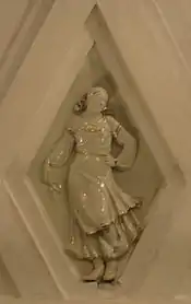 Своды боковых залов и проходов между пилонами оформлены квадратными кессонами[23]. Свод центрального зала трактован иначе. Он отделан ромбовидными кессонами, нижний ряд которых украшен скульптурными вставками из глазурованного фарфора на тему театрального искусства народов СССР[18]. Фигурки имеют высоту около метра[24]. Они изображают мужчин и женщин в национальных костюмах, которые танцуют или играют на музыкальных инструментах[23]. Из 11 существовавших в 1938 году советских республик представлены только 7: Армения, Белоруссия, Грузия, Казахстан, Россия, Узбекистан и Украина[21]. Скульптуры были изготовлены на Ленинградском фарфоровом заводе по эскизам скульптора Н. Я. Данько[20]. Сама Данько отмечала сложность изготовления столь больших фарфоровых фигур: «Ни у нас, ни на Западе эта технология ещё не была разработана. Чтобы фигуры не трескались и не коробились, применяли новый, комбинированный способ формовки. В гипсовую форму, снятую с барельефа, вливали жидкую фарфоровую массу и оставляли, пока она не застынет. Потом на оставшуюся в форме массу вручную накладывали необходимое количество фарфорового теста»[21]. Скульптуры чередуются с фруктовыми венками, которые продублированы и в верхних рядах кессонов[23]. Все барельефы — белые с лёгкой позолотой[8].