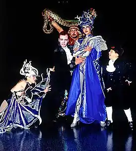 В постановке использовались спецэффекты, трюки и иллюзии (такие как появление и исчезновение людей и предметов на сцене, пробивание актёра копьем, воскрешение расчленённой мумии, отрубание бутафорских конечностей, фехтование, искусственный туман, сценические газовые горелки, видеопроекции), различные технологические решения. В шоу сочетались хореография, цирковые трюки, видеоэкраны и кукольный театр. По форме зрелище было близко к мюзиклу.