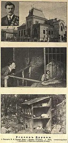Москва получила интересный рождественский подарок: «звериный» уголок, устроенный талантливым клоуном В. Л. Дуровым. Капиталисты-буржуа бросают десятки и сотни тысяч на создание шато-кабаков, ресторанов, трактиров, а клоун, потешавший публику на цирковых аренах шутовскими выходками, правда, всегда остроумными, создал учреждение общественно полезное, вложив в него всё, что им было заработано в течение долгой артистически-цирковой деятельности.