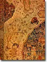 Уникальным был и ковер, фрагмент которого хранился в частном собрании в Будапеште (илл. 121). В крупном по размеру центральном медальоне выткана придворная сцена: группа людей, расположившихся вокруг садового павильона, за которым видны ветви деревьев с сидящими на них птицами. Фигурки придворных по трактовке близки миниатюрам Султана Мухаммеда 1530—1540 годов. Это позволяет отнести ковер к первой половине XVI века и предположить, что рисунок для него создал если не сам Султан Мухаммед, то кто-либо из его художественной мастерской. В отличие от миланского ковра медальон будапештского имеет синий фон; по контрасту с ним остальное поле ковра сделано светлым и заполнено изображением ветвистых деревьев, птиц, ланей, тигра, напавшего на быка, и др.