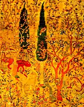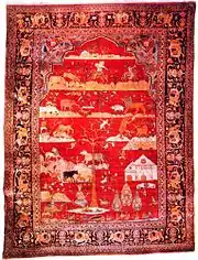 Богатейшим ландшафтом со стройными кипарисами, весенними цветущими деревьями и снующими между ними зверями и птицами представляется композиция тебризского ковра, хранящегося в Музее декоративного искусства в Париже. Красочная гамма ковра, не столь контрастная, как обычно, построена на сочетании теплых охристых, красных и коричневых тонов. По мотивам узора, в котором отсутствуют фигурки охотников, этот ковер относится к группе «звериных».