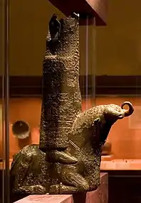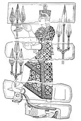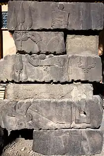 | Бронзовая статуэтка бога Тейшебы, обнаруженная при раскопках Тейшебаини, Исторический музей Армении | Барельеф с изображением божества из развалин урартской крепости в Адильджевазе и его прорисовка. Ванский музей. | Обломок урартского трона из Топрак-кале, бронза, Эрмитаж. | |