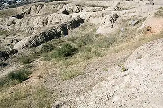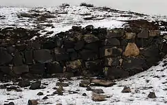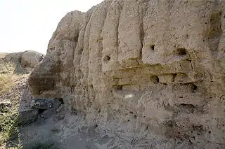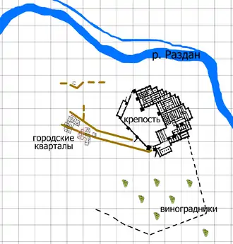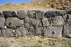 | Крепостные стены города были построены из сырцевого кирпича поверх фундамента из базальтовых камней. За прошедшие тысячелетия сырцевой кирпич превратился в глиняную массу, где просматриваются линии кирпичной кладки. Под воздействием внешней среды в настоящее время стены крепости «оплывают» и разрушаются. | |
