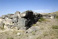 | Общий вид незаконсервированного городища | Структура крепостной стены Тейшебаини |