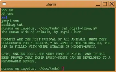 cat в окне xtermОсновная цель применения текстовых данных — «общий знаменатель», независимость от отдельных программ, требующих собственного кодирования или форматирования и несовместимых с другими программами. Текстовые файлы (файлы в текстовом формате) могут быть открыты, прочитаны и отредактированы в любых текстовых редакторах, таких как MS-DOS Editor (DOS), Блокнот (Windows), ed, vi и vim (UNIX, Linux), SimpleText, TextEdit (Mac OS X) и т. п. Другие программы также как правило умеют читать и импортировать текстовые данные. Просмотреть текстовые файлы можно также встроенными командами (type в DOS и Windows) и утилитами (cat в Unix).
