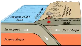 - Океаническая плита с океанической. В таком случае одна из плит заползает под другую и также формируется зона субдукции, над которой образуется островная дуга.
