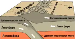 - Континентальная плита с океанической. Океаническая кора плотнее, чем континентальная, и погружается под континент в зоне субдукции.