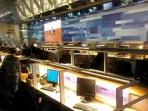 - специально оборудованное помещение, откуда ведутся телевизионные передачи[1] или осуществляется их запись. Для создания требуемых акустических характеристик звучания стены и потолок студии покрывают звукопоглощающими материалами. Студия оборудуется системой освещения (в современных студиях - с программным управлением, обеспечивающим быстрое воспроизведение режимов освещения, найденных во время репетиций). Для отвода тепла, выделяемого осветительными приборами, студию оборудуют системой принудительной вентиляции с кондиционированием воздуха. Последние размещаются в студии на подвижных тележках (штативах) и соединяются с оборудованием аппаратных многожильным кабелем[2]. Декорации, реквизит, ведущие и гости располагаются на специальной площадке — Studio floor. Это «записываемая» часть студии. Всё то, что находится в этой части студии попадает в объективы камер. Совместно с режиссёрской аппаратной (в которой размещаются рабочие места режиссёра и звукооператора, из которой режиссёр руководит работой ассистентов режиссёра и операторов телевизионных передающих камер) и студийной технической аппаратной (в которой размещается основное оборудование усиления и преобразования телевизионных сигналов, поступающих от телекамер) образуют аппаратно-студийный блок