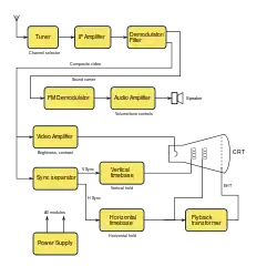 Классический аналоговый телевизор содержит блок питания, радиоприёмник, звукоусилительный тракт с громкоговорителями, видеоусилитель, блок развёрток, отклоняющую систему и кинескоп. Селектор каналов является главной составной частью радиоприёмника и предназначен для выбора принимаемого телевизионного канала и его преобразования в промежуточную частоту. Только самые первые электронные телевизоры выполнялись по схеме приёмника прямого усиления, все последующие строятся по схеме супергетеродина. Поэтому селектор каналов состоит из усилителя высокой частоты, смесителя и гетеродина[34].