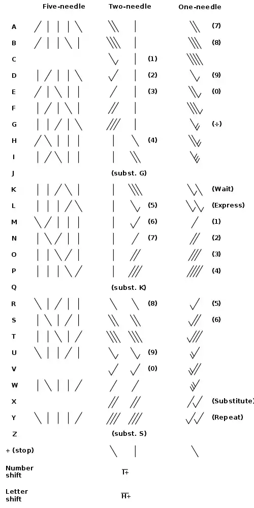 Двухстрелочный телеграф требовал трех проводов, по одному для каждой стрелки и общего возврата. Кодирование несколько отличалось от пятистрелочного телеграфа, и его нужно было изучать, а не читать с дисплея. Стрелки могли перемещаться влево или вправо на один, два или три раза подряд, или на одновременно в обоих направлениях в быстрой последовательности. Любая стрелка в отдельности или обе вместе могли быть перемещены. Это дало в общей сложности 24 кода, один из которых был занят кодом остановки. Таким образом, три буквы были опущены: J, Q и Z, которые были заменены G, K и S соответственно.[21]