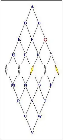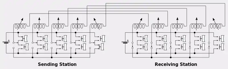 Телеграф Кука и Уитстона состоял из ряда магнитных стрелок, которые можно было повернуть на короткое расстояние либо по часовой стрелке, либо против часовой стрелки под действием электромагнитной индукции в обмотке. Направление движения определялось направлением тока в телеграфных проводах. Стрелки были закреплены на доске размеченной ромбовидной сеткой с буквой на каждом пересечении линий так, что когда две стрелки были под напряжением, они указывали на нужную букву букву. Количество проводов, требуемых системой Кука и Уитстона, равно количеству используемых стрелок. Количество стрелок определяло количество символов, которые могут быть закодированы. Патент Кука и Уитстона рекомендовал пять стрелок, и это было их количество в ранних демонстрационных моделях. Количество кодов, которые могут быть получены из 2, 3, 4, 5, 6 ... стрелок, составляет 2, 6, 12, 20, 30 ... соответственно.[23] На отправляющем конце было два ряда кнопок, пара кнопок для каждой катушки в каждой строке. Оператор выбрал одну кнопку из каждой строки. Это соединяло две катушки с положительным и отрицательным концами батареи соответственно. Другие концы катушек были соединены с телеграфными проводами и оттуда на один конец катушек на приемной станции. Другой конец приемных катушек был соединен вместе когда аппарат находился в режиме приема. Таким образом, ток течет через те же две катушки с обоих концов и возбуждает те же две стрелки. С помощью этой системы стрелки всегда включались парами и всегда вращались в противоположных направлениях. [24]