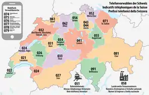 Так называемый национальный код назначения — код зоны в Швейцарском плане нумерации. Телефонные номера могут быть перенесены из одного кода в другой. Также следует отметить, что с введением MNP код назначения не стоит использовать как идентификатор мобильного оператора. С его помощью можно только определить первоначальную сеть. Ниже представлены актуальные коды назначения.[2]