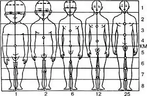 Возрастные различия в пропорциях тела общеизвестны: ребёнок отличается от взрослого относительно короткими ногами, длинным туловищем, большой головой (рис). Для характеристики возрастных изменений пропорций тела можно выражать размеры у детей в долях величины этих размеров у взрослых, приняв их за единицу. Ниже приведены данные возрастных изменений пропорций тела у мальчиков (по Бунаку)[3]: