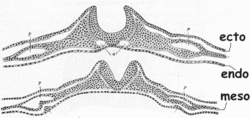 На западе различают три основных типа телосложения: эктоморфный, мезоморфный и эндоморфный. Эти названия они получили от наименований трех зародышевых листков: наружного — эктодермы, из которого формируется нервная система, покровные ткани (кожа) и железы; мезодермы, из которого формируются костно-мышечная и сердечно-сосудистая система; внутреннего — эндодермы, из которого формируется пищеварительный тракт. Известно, что к концу третьей недели развития зародыш человека имеет вид трёхслойной пластинки, или трёхслойного щитка. В области наружного зародышевого листка видна нервная трубка, а глубже — спинная струна, то есть появляются осевые органы зародыша человека. Тело зародыша из плоского щитка превращается в объёмный, эктодерма покрывает тело зародыша со всех сторон. Из эктодермы в дальнейшем образуются нервная система, эпидермис кожи и её производные, эпителиальная выстилка ротовой полости, анального отдела прямой кишки, влагалища. Мезодерма даёт начало внутренним органам (кроме производных эндодермы), сердечно-сосудистой системе, органам опорно-двигательного аппарата (костям, суставам, мышцам), собственно коже. Эндодерма, оказавшаяся внутри тела зародыша человека, свёртывается в трубку и образует эмбриональный зачаток будущей кишки. Узкое отверстие, сообщающее эмбриональную кишку с желточным мешком, в дальнейшем превращается в пупочное кольцо. Из эндодермы формируются эпителий и все железы пищеварительной системы и дыхательных путей.
