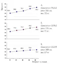 Большой интерес представляют исследования Шелдона и его учеников, которые были посвящены изучению изменения веса тела (рост-весового индекса) человека на протяжении его жизни в зависимости от соматотипа. Было проведено огромное количество антропологических измерений на протяжении десятков лет, и полученные результаты были сведены в таблицы. На основании этих таблиц возможен прогноз веса индивидуума мужского или женского пола в различные жизненные периоды в зависимости от его роста и соматотипа.