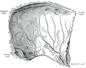 Теменная кость имеет форму выпуклой вовне четырёхугольной пластинки, в которой выделяют две поверхности, наружную и внутреннюю, четыре края, лобный, сагиттальный, затылочный и чешуйчатый, и четыре угла, лобный, затылочный, сосцевидный и клиновидный. По краям теменные кости соединяются между собой и с четырьмя другими костями шестью швами: венечным, сагиттальным, ламбдовидным, теменно-сосцевидным, чешуйчатым и клиновидно-теменным[2].