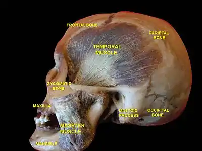 Чешуйчатый край (нижний), márgo squamósus[5], подразделяют на три участка. Спереди край тонкий и заострённый, он скошен за счёт наружной поверхности и прикрывается краем большого крыла клиновидной кости. Средний участок изогнут и также скошен, он прикрыт чешуёй височной кости. Задний участок толще других, он соединяется зубцами с сосцевидным отростком височной кости. По этим трём участкам чешуйчатый край образует три шва: клиновидно-теменной шов, sutúra sphenoparietális, чешуйчатый шов, sutúra squamósa, и сосцевидно-теменной шов, sutúra parietomastoídea.