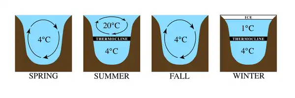 В озёрах умеренного климата летом наблюдается прямая стратификация, зимой — обратная, а весной и осенью устанавливается гомотермия. При этом в них летом обычно наблюдается резкий скачок температуры на небольшом слое (вплоть до 10 °С на метр глубины), называемом металимнион; зоны выше и ниже называются эпилимнионом и гиполимнионом соответственно. Зимой же разница температур обычно значительно меньше, в пределах 4 °С[1]. Благодаря смене типа температурной стратификации происходит перемещение воды разной температуры, увеличивающее насыщенность глубинных слоёв кислородом[2]