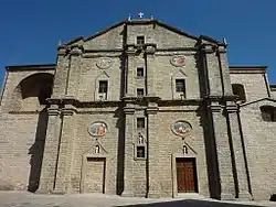 Южный фасад собора Сан-Пьетро - Церковь Ностра-Синьора-дель-Розарио, XIV—XVIII век[10][11]. Фасад в стиле арагонской готики с арочным порталом и фризом в виде полукруглых арочек на кронштейнах увенчан фронтоном с волютами, тремя небольшими мраморными статуэтками и звонницей, колокол которой сохранился с 1633 года. В интерьере — единственный неф разделён на четыре травеи стрельчатыми арками, поддерживающими двускатный кессонный потолок; деревянный алтарь XVIII века.