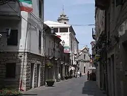 - Церковь Санта-Кроче, XIII—XIX в.[9] пристроена к колокольне собора Сан-Пьетро, и в то же время имеет собственную звонницу на крыше. Первоначально построенная в романском стиле, церковь подверглась многократным значительным реконструкциям. В фасаде, появившемся в 1830-е годы, сочетаются черты барокко и неоклассицизма. Он разделён карнизом по горизонтали на две части, украшенные лопатками, и увенчан треугольным фронтоном. Интерьер — однонефный, потолок в виде цилиндрического свода усилен круглыми арками. С правой стороны в нише — горельеф XVI века из орехового дерева «Снятие ангелами с креста». Замечателен также деревянный алтарь с изображением распятия. В 1997 году в церкви был установлен орган работы П. Чиреза на 4 регистра.