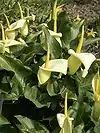 Многолетние клубневые растения; культивируются из-за привлекательных соцветий с покрывалом необычной формы или окраски; некоторые виды имеют пёструю окраску листьев. Применяются в основном для создания живописных групп в затенённых местах у водоёмов или на влажных участках среди деревьев. | |