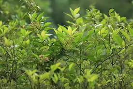 Небольшие кустарники примечательны прежде всего окраской молодых листьев (красноватых или бронзовых оттенков). Используется в групповых посадках преимущественно у водоёмов. | |