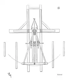 Для стрельбы верхняя часть рычага отводилась назад при помощи ворота и фиксировалась; в желобок на стойке заряжалась стрела, производилось прицеливание машины, после чего спусковое устройство (так называемый крюк-фиксатор) освобождалось и рычаг с силой ударял по тыльной части стрелы[2].