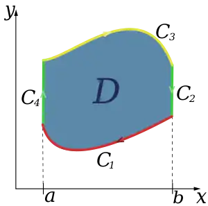 В физике и математике теорема Грина дает соотношение между криволинейным интегралом простой ограниченной кривой С и двойным интегралом по плоской поверхности D ограниченной кривой С. И в общем виде записывается следующим образом
