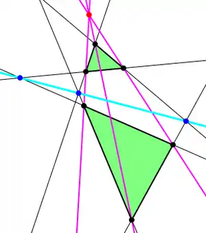 Если два треугольника расположены на плоскости таким образом, что прямые, соединяющие соответственные вершины треугольников, проходят через одну точку, то три точки, в которых пересекаются продолжения трёх пар соответственных сторон треугольников, лежат на одной прямой.