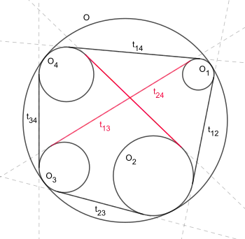 Пусть — окружность радиуса . Пусть — (в указанном порядке) четыре непересекающихся окружности, лежащие внутри и касающиеся её. Обозначим через длину отрезка между точками касания внешней общей касательной окружностей . Тогда[1]:
