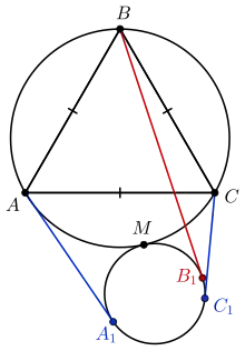 Пусть окружность касается описанной окружности равностороннего треугольника в произвольной точке . Проведём касательные , , к этой окружности из вершин треугольника. Тогда .