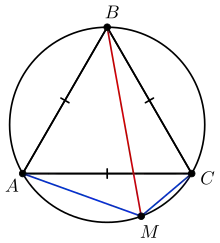 Пусть дан равносторонний треугольник, вписанный в окружность. Тогда для любой точки этой окружности расстояние от неё до одной из вершин треугольника равно сумме расстояний до двух остальных вершин. В частности, для рис. справа имеем: . В симметричном виде эта формулировка может быть записана в виде: или .