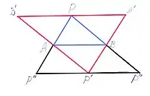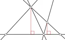 Пусть одна из данных прямых не проходит через одну из точек пересечения . Найдём точку пересечения и прямую, для которых расстояние меньше, чем от до . Поскольку число пересечений конечно, это даст противоречие. Случай, когда через проходит прямая, не параллельная , изображён на рисунке. Если же проходящая через третья прямая параллельна прямой , то рассмотрим треугольник , средние линии которого образуют треугольник , где и — точки пересечения двух проходящих через прямых с прямой . Если третья проходящая через прямая не пересекает отрезок , то расстояние от точки до неё меньше, чем до . Аналогично, если третья проходящая через прямая не пересекает отрезок , то расстояние от точки до неё меньше, чем до . Если же третья проходящая через прямая пересекает отрезок и третья проходящая через прямая пересекает отрезок , то возникает точка пересечения этих прямых. Если она не совпадает с , то она ближе к прямой , чем . Если же она совпадает с , то применим вышеприведённое рассуждение к ней и прямой . Возникнет треугольник , средние линии которого образуют треугольник . Заменяя теперь в наших рассуждениях треугольник на треугольник и действуя далее аналогично, получаем противоречие с конечностью множества. ■