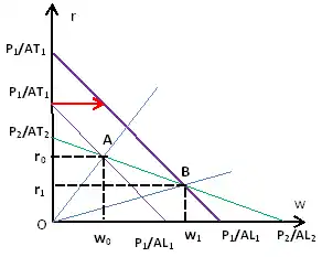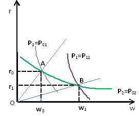Эффект изменения относительных цен товаров демонстрирует также Диаграмма с изоквантами, где увеличение относительной цены товара 1 показано смещением кривой равных цен для товара 1 с к . В результате точка пересечения двух кривых равных цен перемещается из точки в точку , где ставка заработной платы, соответствующая производству в экономике обоих товаров, увеличивается с до , а соответствующая ставка ренты на капитал снижается с до . Поскольку цена товара 1 возросла, а остается постоянной, ставка заработной платы увеличилась относительно цен обоих товаров. Поскольку ставка ренты на капитал является той ставкой ренты, которая соответствует постоянному отношению ренты к , ставка ренты на капитал снижается относительно цен обоих товаров[4].