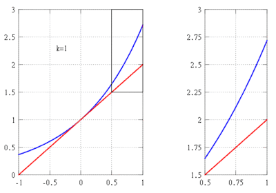 где ξ — это некоторое число между 0 и x. Поскольку ex возрастает согласно (*), мы можем использовать ex ≤ 1 для x ∈ [−1, 0], чтобы оценить остаток на подынтервале [−1, 0]. Для нахождения верхней границы значения остатка на интервале [0,1], можем использовать свойство eξ<<ex для 0<ξ<x, чтобы оценить