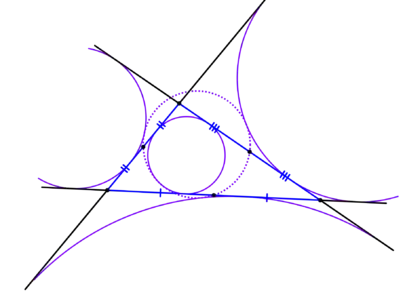 - Точки попарного касания вписанной и трех вневписанных окружностей с окружностью девяти точек называются точками Фейербаха.