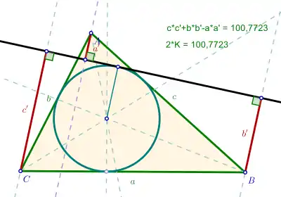 Пусть треугольник задан своими вершинами A, B и C, противоположные вершинам стороны имеют длины a, b и c, площадь равна K и прямая касается вписанной в треугольник окружности в произвольной точке. Обозначим расстояния от вершин треугольника до прямой через a ', b ' и c ', при этом, если вершина и центр окружности лежат по разные стороны от прямой, расстояние считается отрицательным. Тогда