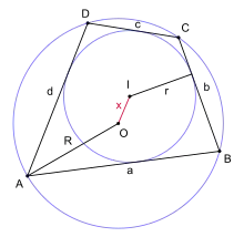 - Для радиусов и соответственно описанной и вписанной окружностей данного вписанно-описанного четырёхугольника (см. рис.) и расстояния между центрами этих окружностей выполняется соотношение: