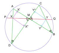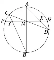 - Пусть через точку М внутри некоторой окружности проведены две произвольные хорды АВ и CD. Пусть хорды AD и ВС пересекают произвольную хорду PQ в точках X и Y. Тогда если М является серединой отрезка XY, то она одновременно является серединой хорды PQ.