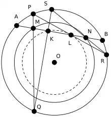 - При помощи проецирования двойных отношений: Рассмотрим двойное отношение точек , и спроецируем его на окружность из точки . Точки и перейдут сами в себя, так как принадлежат окружности, а точки и перейдут в точки и соответственно. Получаем (последнее следует трактовать как двойное отношение точек на комплексной плоскости). Проецируем обратно на прямую с центром в точке , получаем . Распишем двойное отношение по определению, получим необходимое равенство.