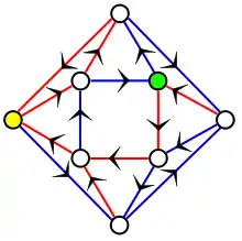 Рисунок показывает ориентированный граф с восемью вершинами, в котором каждая вершина имеет полустепень исхода 2 (в данном графе каждая вершина имеет полустепень захода также равную 2, но это не обязательно, чтобы синхронизирующая раскраска существовала). Рёбра графа выкрашены в красный и синий цвета для образования синхронизирующей раскраски.