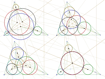 Подобрав радиусы трёх окружностей соответствующим образом (и выставив окружности наружу), можно получить прямые вместо трёх оставшихся окружностей. Эти прямые образуют треугольник, а все четыре нарисованные окружности будут создавать ситуацию с последнего рисунка среди четырёх примеров к основной теореме, где также видны три чевианы к точкам касания окружностей и прямых, пересекающиеся в одной точке.