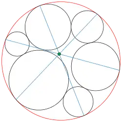 Проведём цепочку из шести черных окружностей (см. рис. справа), каждая из которых касается седьмой окружности (красная) и двух соседних окружностей. Тогда три линии (синие), проведенные между противоположными парами точек касания с седьмой окружностью, пересекаются в одной точке (зеленая). Эта элементарная по сути теорема не была известна вплоть до 1974 года [2][3].