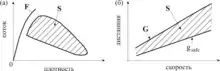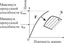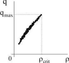 Эмпирические данные, относящиеся к свободному потоку, показывают положительную корреляцию между величиной потока , измеряемой в количестве машин в единицу времени, и плотностью , измеряемой в количестве машин на единицу длины дороги. Зависимость потока от плотности для свободного потока ограничена максимальным значением величины потока и соответствующим критическим значением плотности (рис. 1).