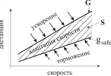 В теории трёх фаз Кернера, машина ускоряется, когда расстояние до машины впереди больше чем дистанция синхронизации скорости , т.е. при (обозначено словом "ускорение" на рис. 5); машина тормозит, когда расстояние меньше чем безопасное расстояние , т.е. при (обозначено словом "торможение" на рис. 5).