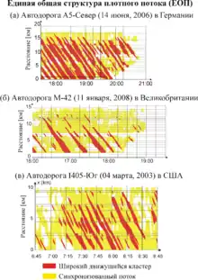 На многих скоростных автомагистралях узкие места располагаются очень близко друг к другу. Пространственно-временная структура, в которой синхронизованных поток охватывает два и более узких места, называется единой структурой плотного потока (ЕП). ЕП может состоять только из синхронизованного потока, тогда она называется ЕСП (единая структура синхронизованного потока). Однако обычно широкие движущиеся кластеры возникают в синхронизованном потоке. В этом случае ЕП называется ЕОП (единая общая структура плотного потока) (см. рис. 9).